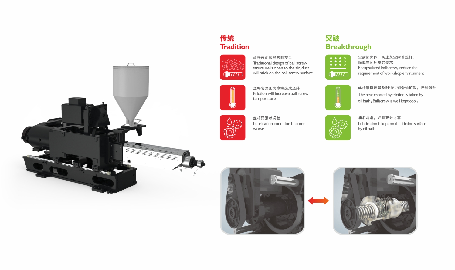 ·Patented closed injection structure design, dustproof, immersion, lubrication, improve screw life.